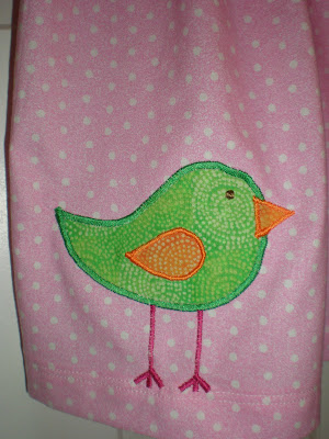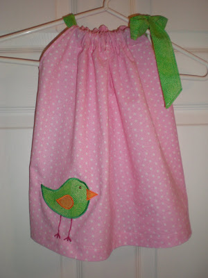 And my favorite pillowcase dress with the bow at one side and a cutie little birdie at the bottom. I was going to make the bird's legs brown but that just seemed to realistic. Pink seemed more Pink Crocodile Designs to me.