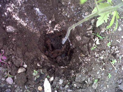 Once the DEEP hole is dug, I drop in some coffee grounds, banana peels and egg shells. I also add a bit of Azomite and Epsom Salts. Then sprinkle a bit of dirt back on top- just a bit though. Then I plant my tomatoes as deep as the now trash filled hole will allow.
