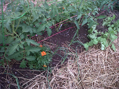 1. I will lay down a strip of newspaper (and eventually straw in a few days when I get up to buy more) in between the two paths of seeds. This will both help me keep the paths very evenly spaced and keep the weeds from growing between the seeds lines. It won't prevent weeds growing elsewhere, but it will help me visually to see things.