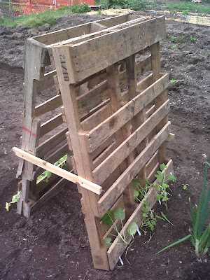 This was the squash house in my community garden plot on May 28th.  Just after being built and planted with the unruly plants that were so disgruntled to live in my dining room instead of outside where squash plants belong.  I was worried that the gardeners would protest my found object creation {instructions here- you should totally make one!} or that my plants would die from shock.